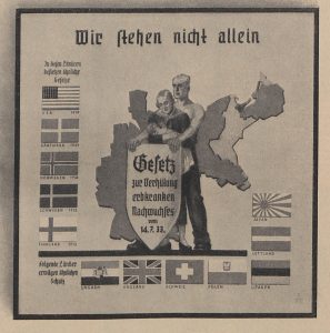 La mijlocul anilor 1930, propagandiștii naziști au susținut că programul lor de sterilizare eugenică nu era diferit de alte legislații similare introduse în țări precum SUA și Suedia și propuse a fi introduse în Japonia și în alte țări europene precum Marea Britanie, Ungaria și Polonia. „Nu suntem noi singurii”, au spus ei, sperând astfel să obțină sprijin internațional pentru planurile lor de eliminare a indivizilor considerați de ei a fi “cu defecte genetice”.